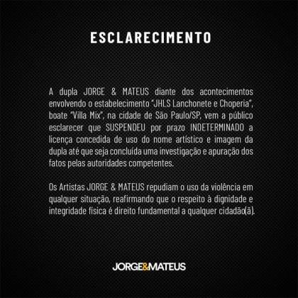 “A dupla Jorge & Mateus diante dos acontecimentos envolvendo o estabelecimento ‘JHLS Lanchonete e Choperia’, boate ‘Villa Mix’, na cidade de São Paulo/SP, vem a público esclarecer que suspendeu por prazo indeterminado a licença concedida de uso do nome artístico e imagem da dupla até que seja concluída uma investigação e apuração dos fatos pelas autoridades competentes. Os artistas Jorge & Mateus repudiam o uso da violência em qualquer situação, reafirmando que o respeito à dignidade e integridade física é direito fundamental a qualquer cidadão”, diz a nota.