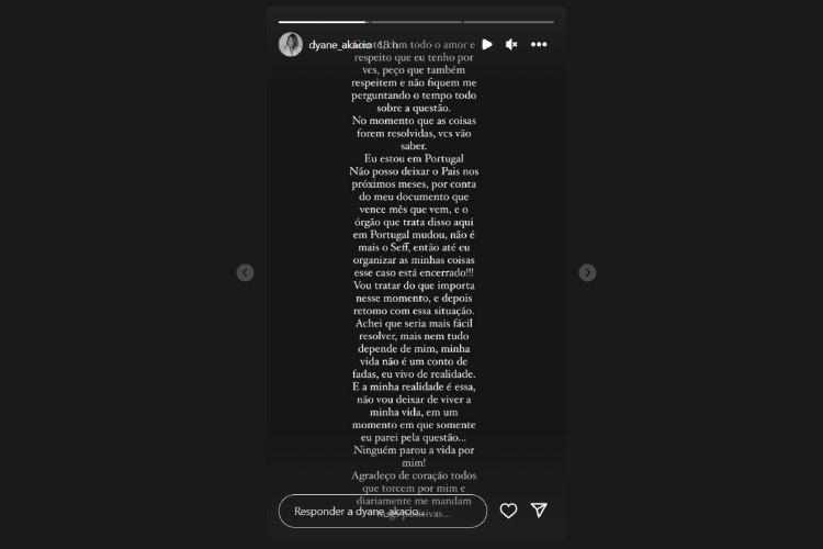 A moça afirmou que está em Portugal e que precisaria vir ao Brasil resolver a questão complicada: “Não posso deixar o país nos próximos meses por conta do meu documento que vence mês que vem e o órgão que trata disso aqui em Portugal mudou. Até eu organizar as minhas coisas, esse caso está encerrado!!!”, declarou ela, na postagem em texto com um fundo preto.