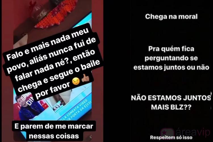 “Falo mais nada, meu povo. Aliás, nunca fui de falar nada, né? Então chega e segue o baile, por favor. E parem de me marcar nessas coisas”, disparou. “Chega, na moral. Pra quem fica perguntando se estamos juntos ou não. Não estamos juntos mais, beleza? Respeitem, só isso”, pediu Dynho Alves.