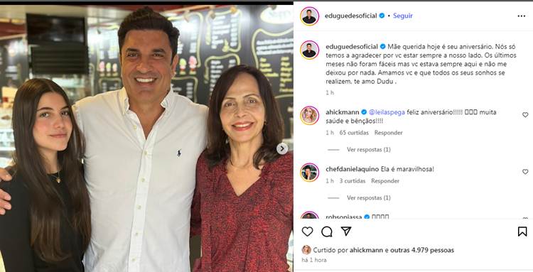 Nos comentários, a apresentadora Ana Hickmann, mulher atual de Edu Guedes, deixou uma mensagem parabenizando a sogra. “Feliz aniversário!!!!! Muita saúde e bênçãos!!!!”, desejou ela.