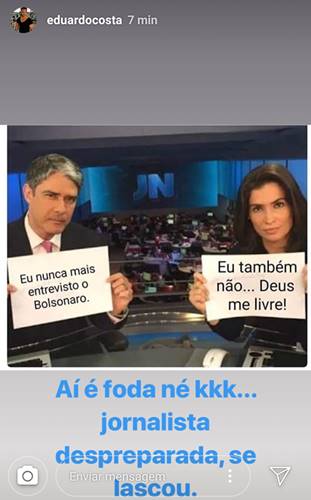 Eduardo postou uma foto com um meme e comentou em sua rede social, sobre a entrevista feita por Bonner e Renata ao candidato Bolsonaro: “Aí é F*** né kkk. Jornalista despreparada se lascou”.