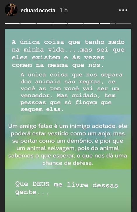 Além do texto da publicação, Eduardo também escreveu e surpreendeu: “A única coisa que tenho medo na minha vida … mas sei que eles existem e às vezes comem na mesma que nós. A única coisa que nos separa dos animas são regras, se você as tem você vai ser um vencedor. Mas cuidado, tem pessoas que só fingem que seguem elas”, disparou ele.