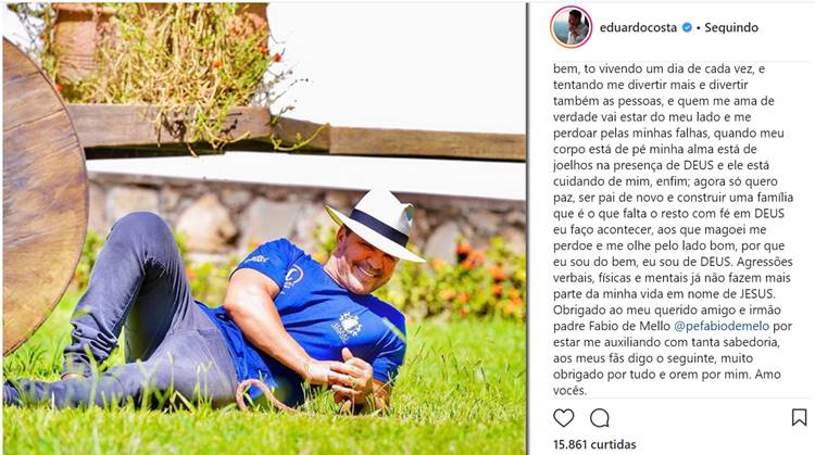 Agressões verbais, físicas e mentais já não fazem mais parte da minha vida em nome de JESUS. Obrigado ao meu querido amigo e irmão padre Fabio de Mello @pefabiodemelo por estar me auxiliando com tanta sabedoria, aos meus fãs digo o seguinte, muito obrigado por tudo e orem por mim. Amo vocês.”, escreveu o cantor.