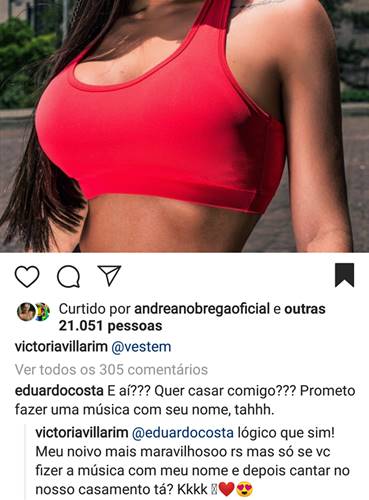 Os seguidores encheram a publicação de elogios e pedidos para eles casarem logo: “Faz sim a música e casem logo,amo vcs juntos”, “vcs dois são maravilhosos”, “Quanto amor”, “Casal lindo”, “@eduardocosta um pedido desses bishu”, “Victoria e linda. Eduardo Costa tem bom gosto“, foram alguns dos comentários recebidos.