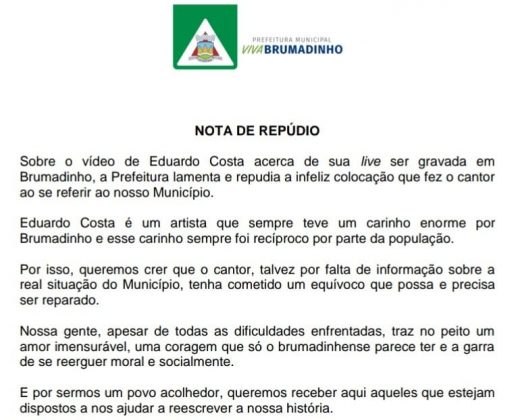 ”Eduardo Costa é um artista que sempre teve um carinho enorme por Brumadinho e esse carinho foi sempre recíproco pela população. Por isso, queremos crer que o cantor, talvez por falta de informação da real situação do município, tenha cometido um equivoco que possa e deva ser reparado.”, diz a nota oficial da cidade.