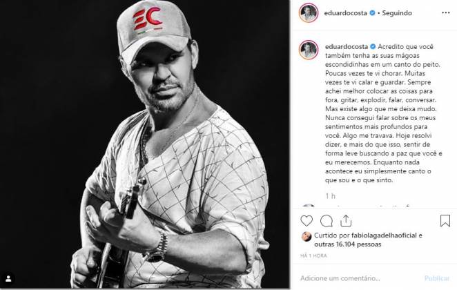 Nos comentários, Eduardo Costa recebeu o apoio dos seus seguidores, e alguns apontaram que era uma mensagem para sua ex-namorada, Victória Villarim. “É por isso que te admiro, você parece ser uma pessoa especial, que bacana estar compartilhando suas vida com seus fã”, disse uma internauta. “Se declarando pra Vitória”, ressaltou a fã. “Deus te abençoe e te proteja sempre”, desejou outra. “Eduardo vá atras da Vitoria mostra que ama ela. Ela também ama você. Corre enquanto a tempo ela é uma mulher especial”, aconselhou outro.
