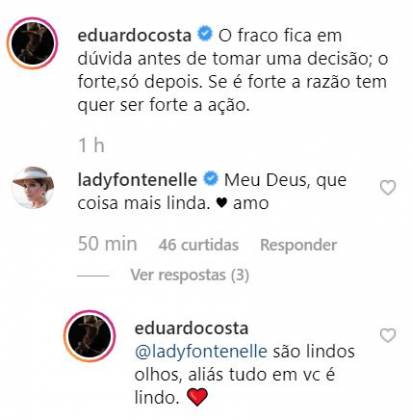 Dentre suas fãs, Antonia Fontenelle também surgiu e se derreteu pelo cantor. No comentário, ela escreveu: “Meu Deus, que coisa mais linda. ♥️ amo.” Em seguida, Eduardo mostrou seu carinho a Fontenelle e respondeu: ” são lindos olhos, aliás tudo em vc é lindo.”