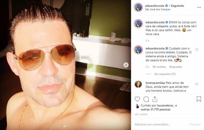 Sem camisa e de óculos de sol, o sertanejo brincou com a própria aparência. “Ehhhh to coroa com cara de cafajeste, putss, aí é foda né!!! Mas é só cara tahhh. Kkkk. Um novo cara”. Depois, nos comentários ele mandou um recado para as novinhas. “Cuidado com o coroa novinha kkkkkk. Cuidado. O sistema ainda é antigo. Sistema de caipira bruto kkk”.