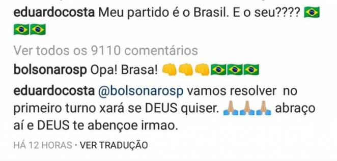 Nos comentários de uma foto publicada por Eduardo, com a camisa de Bolsonaro, o filho de Jair Bolsonaro, Eduardo Bolsonaro, respondeu a publicação de Eduardo Costa: “Opa! Brasa!”, escreveu ele. “Vamos resolver no primeiro turno xará se DEUS quiser. Abraço aí e Deus te abençoe irmão”, respondeu o sertanejo.