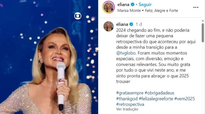 Nas redes sociais, Eliana compartilhou uma retrospectiva de 2024. Ela destacou aprendizados e momentos importantes do ano. A transição simbolizou gratidão e preparação para projetos futuros.