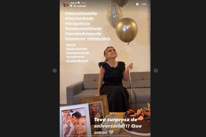 No novo registro compartilhado em seu Stories, a apresentadora surge com balões nas mãos e agradece a todos pelo carinho. “Teve surpresa de aniversário! Que amor”, escreveu Eliana na legenda.