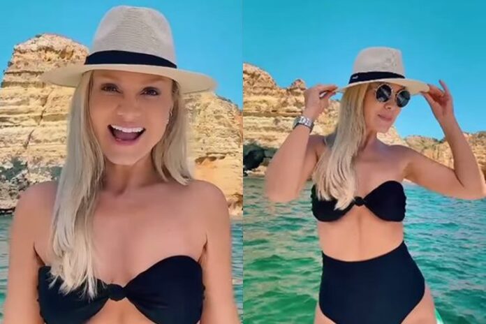 A apresentadora Eliana segue gravando seus conteúdos para irem ao ar em seus últimos programas no SBT e, enquanto descansava da correria, a loira mais querida dos domingos do país, curtiu só de biquíni uma das mais belas praias portuguesas em Algarve.