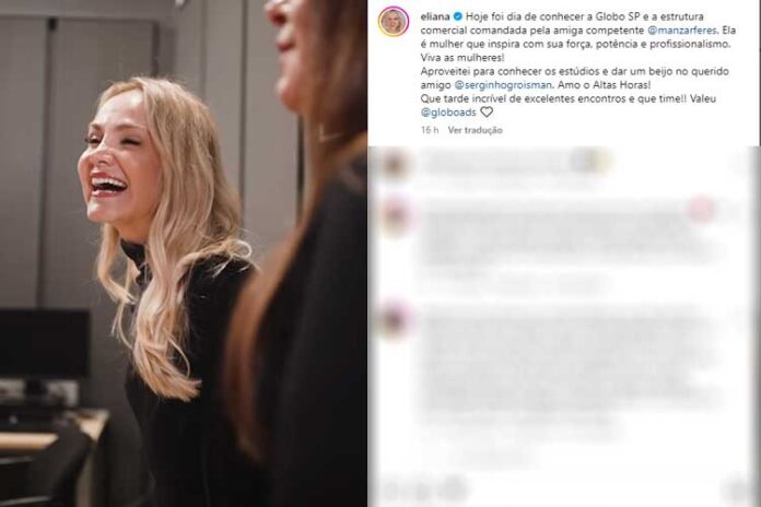 Durante a visita, Eliana se encontrou com Serginho Groisman. “Aproveitei para conhecer os estúdios e dar um beijo no querido amigo. Amo o Altas Horas! Que tarde incrível de excelentes encontros e que time!!”, agradeceu.