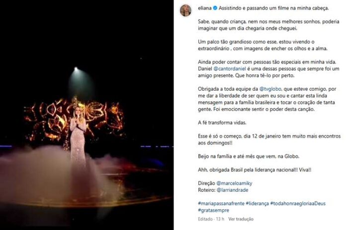 “Obrigada a toda equipe da TV Globo, que esteve comigo, por me dar a liberdade de ser quem eu sou e cantar esta linda mensagem para a família brasileira e tocar o coração de tanta gente. Esse é só o começo, dia 12 de janeiro tem muito mais encontros aos domingos!! Ahh, obrigada Brasil pela liderança nacional!! Viva!!”, completou.