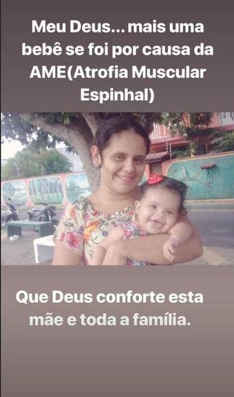 Ela postou um registro da mãe com a criança no colo e lamentou o drama vivido por ela. “Meu Deus…mais uma criança se foi por causa da AME (Atrofia Muscular Espinhal). Que Deus conforte esta mãe e toda a família”, disse ela.