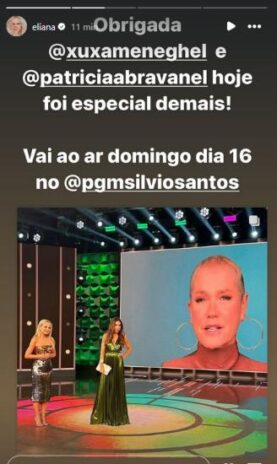 “Obrigada, Xuxa Meneghel e Patrícia Abravanel. Hoje foi especial demais”, declarou Eliana no story do Instagram, compartilhando uma imagem da gravação do programa do dono do baú, que atualmente é comandado pela filha.