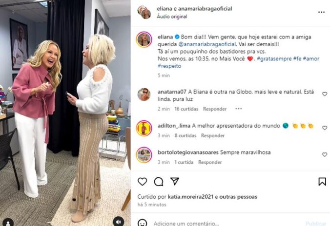 Adiante, ela mostra mais detalhes do encontro delas e, claro, muito papo não faltou: “Bom dia!!! Vem gente, que hoje estarei com a amiga querida @anamariabragaoficial. Vai ser demais!!! Tá aí um pouquinho dos bastidores pra vcs. Nos vemos, as 10:35, no Mais Você ❤️“, publicou ela, convidando seu público para lhe assistir no matinal.