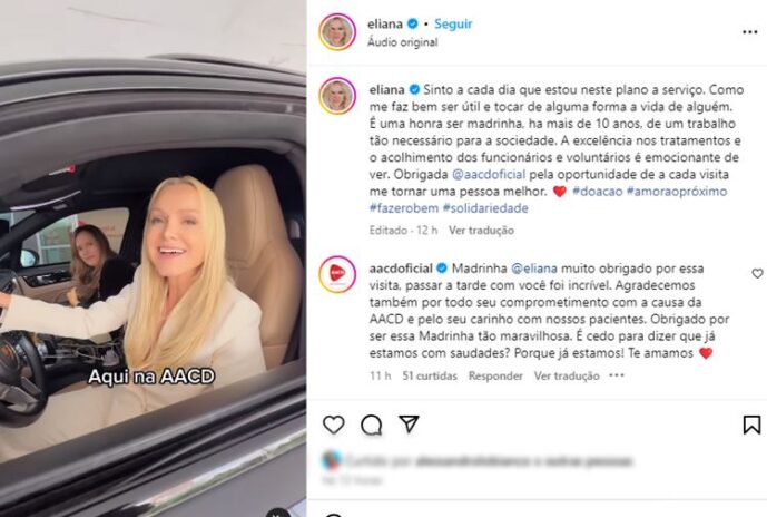 Nos comentários, o perfil da AACD reagiu e afirmou que já estão com saudades das visitas dela a instituição: “Madrinha @eliana muito obrigado por essa visita, passar a tarde com você foi incrível. Agradecemos também por todo seu comprometimento com a causa da AACD e pelo seu carinho com nossos pacientes. Obrigado por ser essa Madrinha tão maravilhosa. É cedo para dizer que já estamos com saudades? Porque já estamos! Te amamos“, pontuaram.
