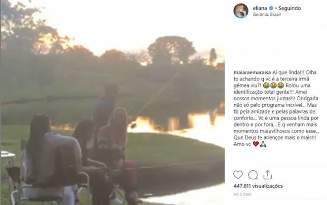 “Eu tive a grata surpresa de conhecer um pouco mais da família e da vida de @maiaraemaraisa. Que meninas inteligentes, de coração sensível e bondoso. Além do prazer profissional de estar com elas, pessoalmente passaria o restinho deste ano “resenhando” com essas gêmeas amadas. Foi um programa maravilhoso (E olha que elas viraram à noite sem dormir). Obrigada por todo o carinho comigo e minha equipe irmãs lindas. Vcs ganharam uma amiga!! Contem comigo. Mais sucesso!! Luv”, escreveu Eliana, postando um vídeo pescando e cantando com a dupla.