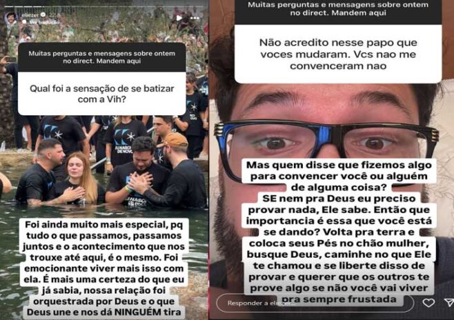 Para Eliezer, o batismo foi uma confirmação do que já sabia em relação ao seu relacionamento com a influenciadora. “É mais uma certeza do que eu já sabia, nossa relação foi orquestrada por Deus e o que Deus une e nos dá ninguém tira”, afirmou.