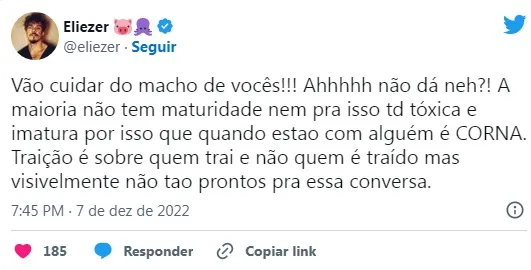 Depois de Viih Tube sair em defesa do pai do seu filho nas redes sociais, Eliezer se irritou com a repercussão do assunto. O ex-BBB rebateu críticas na web e garantiu que não houve traição. “Vão cuidar do macho de vocês! Ah, não dá, né? A maioria não tem maturidade nem pra isso, tudo tóxica e imatura, por isso que quando estão com alguém são cornas. Traição é sobre quem trai e não quem é traído, mas visivelmente não estão prontos pra essa conversa”, escreveu o influencer no Twitter.