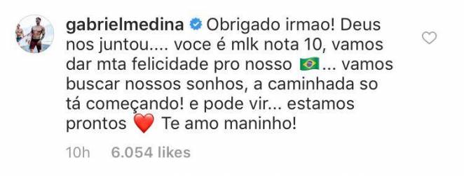 Medina retribuiu o carinho nos comentários do post. “Obrigado, irmão! Deus nos juntou, você é moleque nota 10, vamos dar muita felicidade pro nosso Brasil. Vamos buscar nossos sonhos, a caminhada só tá começando! E pode vir, estamos prontos. Te amo, maninho!”.