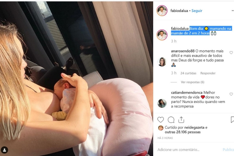 Na imagem, compartilhada no Instagram de Fábio da Lua, Thaeme, mamãe coruja que só, aparece, encantada, amamentando a bebê. Na legenda, o empresário entregou o fluxo de amamentação da sertaneja: “Bom dia, mamando na mamãe de 2 em 2 horas”, escreveu.
