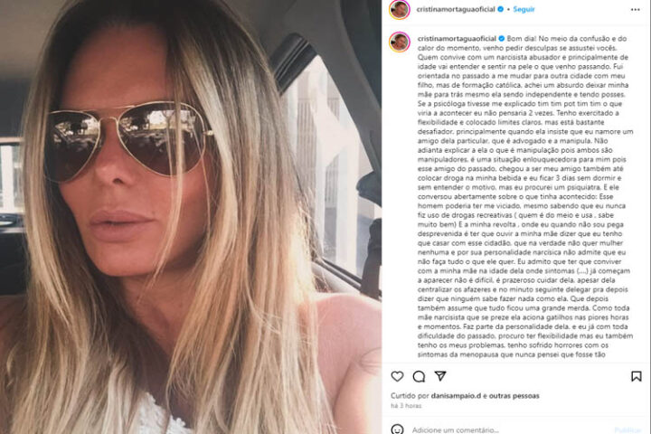 Por fim, Cristina pediu desculpas a todos os seus seguidores após anunciar a sua suposta morte no Instagram. “Esse é um esclarecimento aos meus seguidores que se preocuparam com o meu estado ontem, que chegou ao limite. Peço desculpas”, conclui o texto. Anteriormente, a apresentadora já havia feito um desabafo nas redes sociais, revelando que está em “depressão profunda”.