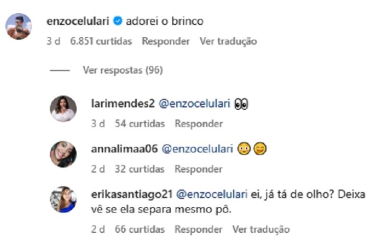 Para muitos internautas, o comentário deixado por Enzo Celulari poderia indicar que, no meio de convívio dos artistas, a suposta notícia sobre o término do noivado entre Jonas e Sulzbach já seria conhecida. Outros, por sua vez, aproveitaram para brincar com a situação, com pessoas insinuando até mesmo que o brinco poderia ter sido um presente dado pelo próprio Enzo Celulari.
