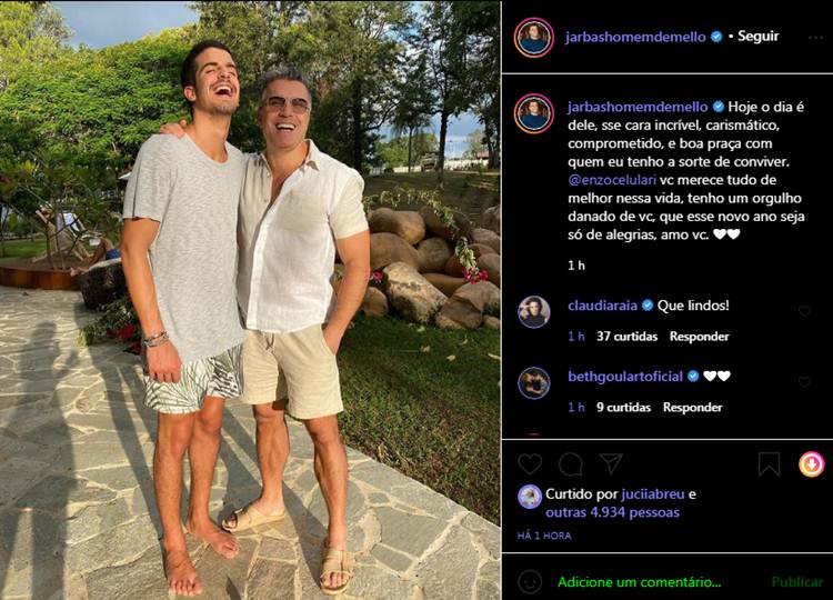 Jarbas, que é casado com Claudia Raia, publicou uma foto ao lado do enteado. “Hoje o dia é dele, esse cara incrível, carismático, comprometido, e boa praça com quem eu tenho a sorte de conviver. @enzocelulari vc merece tudo de melhor nessa vida, tenho um orgulho danado de vc, que esse novo ano seja só de alegrias, amo vc. ❤❤”, escreveu na legenda.