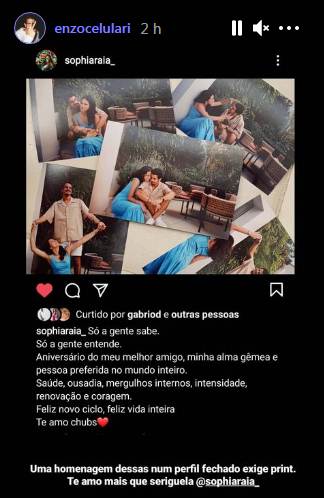 A irmã também encheu Enzo de carinho publicando vária fotos da dupla. “Só a gente sabe. Só a gente entende. Aniversário do meu melhor amigo, minha alma gêmea e pessoa preferida do mundo inteiro. Saúde, ousadia, mergulhos internos, intensidade, renovação e coragem. Feliz novo ciclo, feliz vida inteira. Te amo chubs” escreveu.