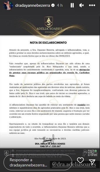 A nota segue.  “A influenciadora Dayanne faz questão de reiterar seu sentimento de repúdio aos infelizes e injustificáveis atos de agressões praticados pelo Sr. Rico e sua irmã, bem como, externar ao seus fãs o seu sentimento de tristeza, angústia e frustação por ter ocorrido em um evento festivo organizado por uma pessoa que nutre imenso carinho e admiração”, diz um trecho do texto.
