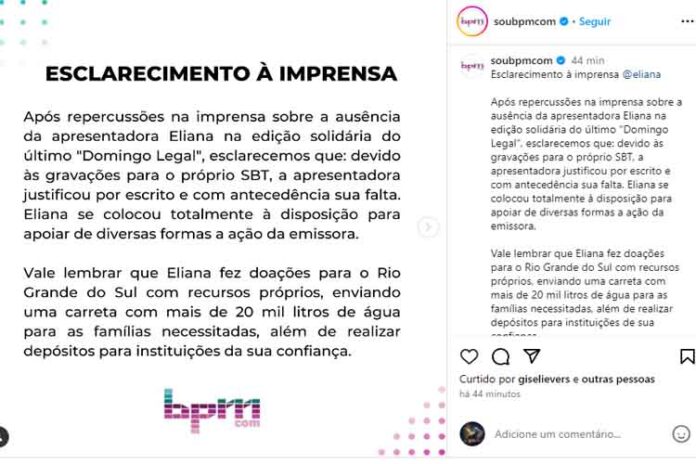 “Após repercussões na imprensa sobre a ausência da apresentadora Eliana na edição solidária do último ‘Domingo Legal’, esclarecemos que: devido às gravações para o próprio SBT, a apresentadora justificou por escrito e com antecedência sua falta”, inicia a nota.