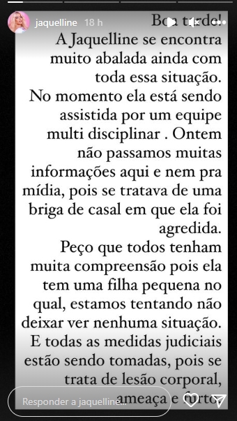 Dessa forma, em nota oficial, a equipe de Jaqueline explicou: “A Jaqueline se encontra muito abalada ainda com toda essa situação. No momento, ela está sendo assistida por uma equipe multidisciplinar. Ontem não passamos muitas informações, pois se tratava de uma briga de casal em que ela foi agredida. Todas as medidas judiciais estão sendo tomadas, pois se trata de lesão corporal, ameaça e furto”, pontuaram no comunicado.