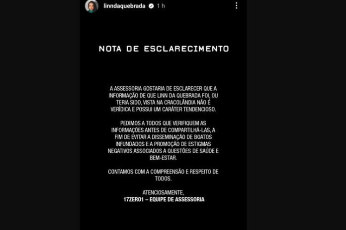 “Nota de esclarecimento. A assessoria gostaria de esclarecer que a informação de que Linn da Quebrada foi, ou teria sido, vista na Cracolândia não é verídica e possui um caráter tendencioso”, afirmaram os representantes da cantora.