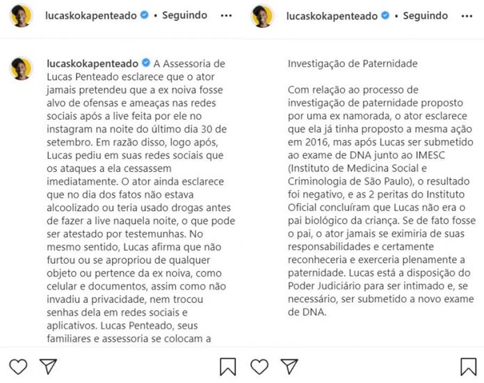 O primeiro assunto abordado foi sobre a ex-noiva. “A Assessoria de Lucas Penteado esclarece que o ator jamais pretendeu que a ex noiva fosse alvo de ofensas e ameaças nas redes sociais após a live feita por ele no instagram na noite do último dia 30 de setembro. Em razão disso, logo após, Lucas pediu em suas redes sociais que os ataques a ela cessassem imediatamente”, começaram.