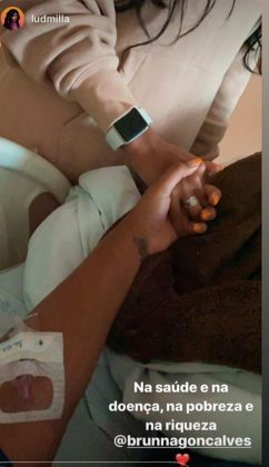 Quem também está acompanhado a cantora no hospital é Brunna Gonçalves, que mais cedo publicou um momento segurando na mão de Ludmilla no Stories do Instagram. “Na Saúde e na doença, na pobreza e na riqueza”.