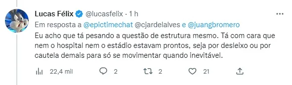 No Twitter, internautas começaram a especular sobre o real estado de saúde do ídolo do futebol. “Eu acho que já era, só tão segurando por causa do natal”, disse um. “Eu acho que ta pesando a questão de estrutura mesmo. Tá com cara que nem o hospital nem o estádio estavam prontos, seja pro desleixo ou por cautela demais para só se movimentar quando inevitável”, opinou outro.