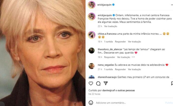 Através de uma publicação no feed do seu Instagram, Erick Jacquin lamentou a morte da artista, lembrando que no passado havia cozinhado para ela. “Ontem, infelizmente, a incrível cantora francesa Françoise Hardy nos deixou. Tive a honra de poder cozinhar para ela algumas vezes. Meus sentimentos à família“, escreveu ele, compartilhando um registro da cantora.