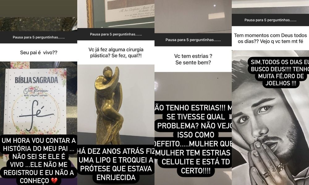 A artista também respondeu outros questionamentos, como se já fez alguma cirurgia plástica. Ela revelou que “Há dez anos atrás fiz uma lipo e troquei a prótese que estava enrijecida”, afirmou.