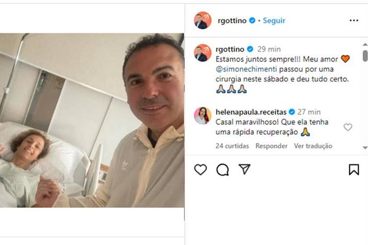 Apesar do susto, Gottino tranquilizou os fãs, afirmando que tudo correu bem. “Estamos juntos sempre! Meu amor, Simone Chimenti, passou por uma cirurgia neste sábado e deu tudo certo”, escreveu ele, acompanhando a mensagem com uma foto ao lado da esposa.
