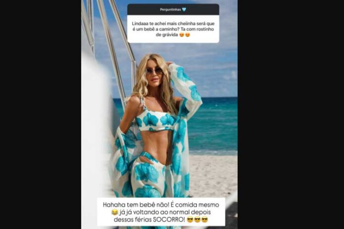 “Lindaaa te achei mais cheinha será que é um bebê a caminho? Tá com rostinho de grávida”, questionou em uma pergunta publicada por Siebert em seu Stories no Instagram. “Hahaha tem bebê não! É comida mesmo. Já já voltando ao normal depois dessas férias SOCORRO!”, respondeu.