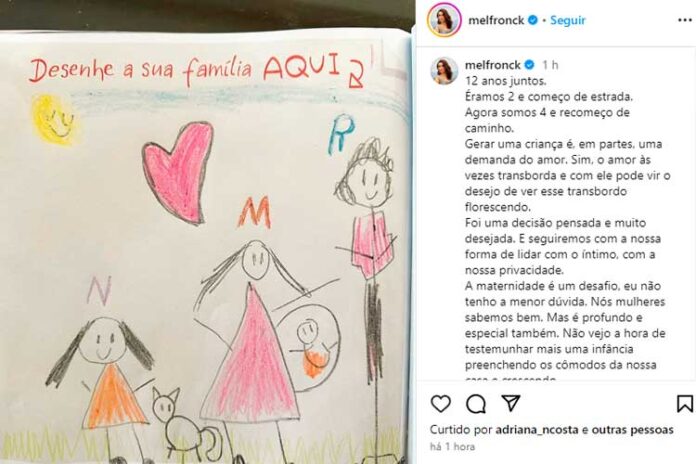 De acordo com Mel, ambos estão juntos há 12 anos e eram apenas dois no início de sua história. O tempo passou e a família cresceu e hoje são quatro. “12 anos juntos. Éramos 2 no começo da estrada. Agora somos 4 e um recomeço de caminho. Gerar uma criança é, em parte, uma demanda do amor. Sim, o amor às vezes transborda e com ele pode vir o desejo de ver esse transbordamento florescendo. Foi uma decisão pensada e muito desejada”, afirmou.