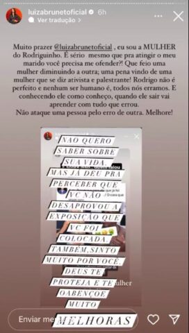Por meio do Instagram, Bruna Amaral disparou: “Muito prazer, Luiza Brunet. Eu sou a mulher do Rodriguinho. É sério mesmo que para atingir o meu marido você precisa me ofender? Que feio uma mulher diminuindo a outra. Uma pena vindo de uma mulher que se diz ativista e palestrante! Rodrigo não é perfeito e nenhum ser humano é, todos nós erramos. E conhecendo ele como conheço, quando ele sair vai aprender com tudo o que errou. Não ataque uma pessoa pelo erro de outra. Melhore!“, disse.