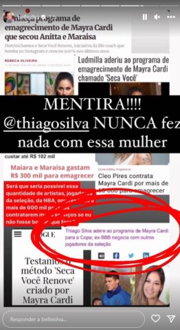 “Mentira! Thiago Silva nunca fez nada com essa mulher”, escreveu Belle. Em uma ocasião anterior, Maíra havia registrado em suas redes sociais: “Tenho muito orgulho de ter levado saúde para os maiores artistas do Brasil e mais de 600 mil pessoas, independente de com que eu sou casada: E contra fatos não há argumentos”.