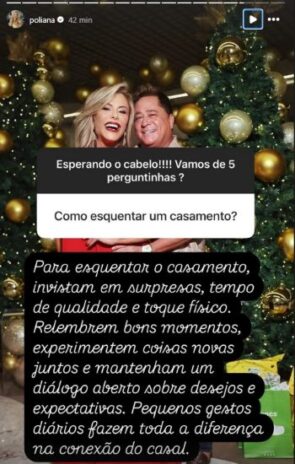 “Como esquentar um casamento?”, indagou a seguidora nos stories do Instagram. “Para esquentar o casamento, invistam em surpresas, tempo de qualidade e toque físico. Relembrem bons momentos, experimentem coisas novas juntos e mantenham um diálogo aberto sobre desejos expectativas. Pequenos gestos diários fazem toda a diferença na conexão do casal”, finalizou.