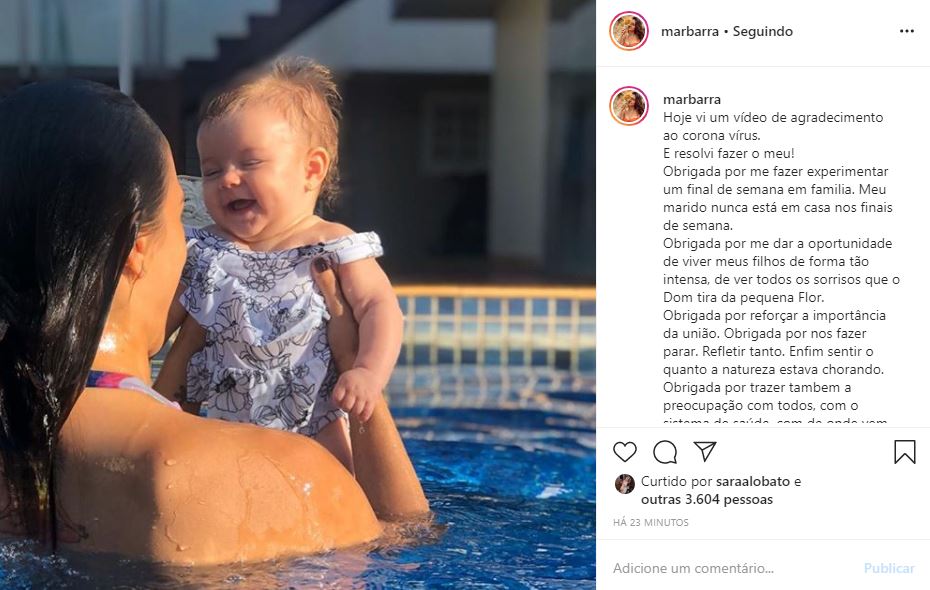 “Hoje vi um vídeo de agradecimento ao coronavírus. E resolvi fazer o meu! Obrigada por me fazer experimentar um final de semana em família. Meu marido nunca está em casa nos finais de semana. Obrigada por me dar a oportunidade de viver meus filhos de forma tão intensa, de ver todos os sorrisos que o Dom tira da pequena Flor. Obrigada por reforçar a importância da união. Obrigada por nos fazer parar. Refletir tanto. Enfim sentir o quanto a natureza estava chorando”, disse ela.