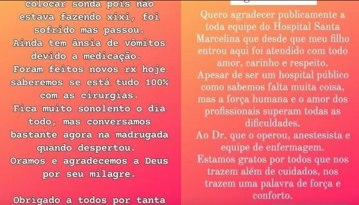 Sendo assim, os familiares do jovem ator de 12 anos, ainda deixaram um recadinho especial para a equipe médica, que lhe atendeu prontamente na última quarta. “Apesar de ser um hospital público, como sabemos, falta muita coisa, mas a força humana e o amor dos profissionais superam todas as dificuldades. Ao Dr. que o operou, anestesista e equipe de enfermagem. Estamos gratos por todos que nos trazem além de cuidados, palavras de força e conforto”, diz o texto.