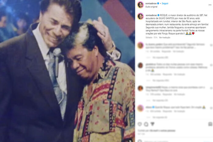 “Roque, o maior diretor de auditório do SBT, fiel escudeiro de Silvio Santos por mais de 50 anos, está hospitalizado em Jundiaí, interior de São Paulo, após ter desmaiado ontem, num restaurante, durante almoço em família! Segundo sua mulher, Janilda Nogueira, os exames apontaram sangramento intracraniano na parte frontal! Todas as nossas orações por ele! Força, Roque querido!!!”, disse, desejando melhoras ao profissional.