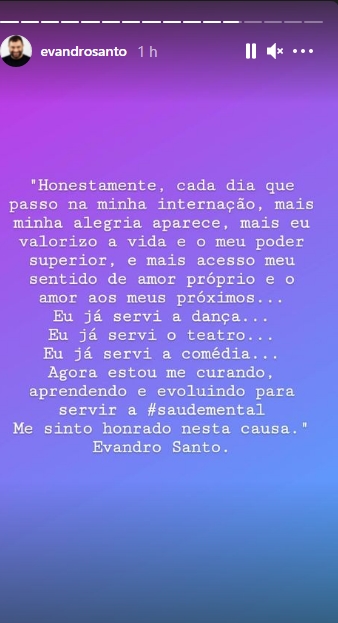 Evandro continuou. “Não é fácil entrar em recuperação, mas é uma delícia quando você entende (…) Fique o tempo que for necessário. Tem gente que fica três, quatro.… Siga lendo